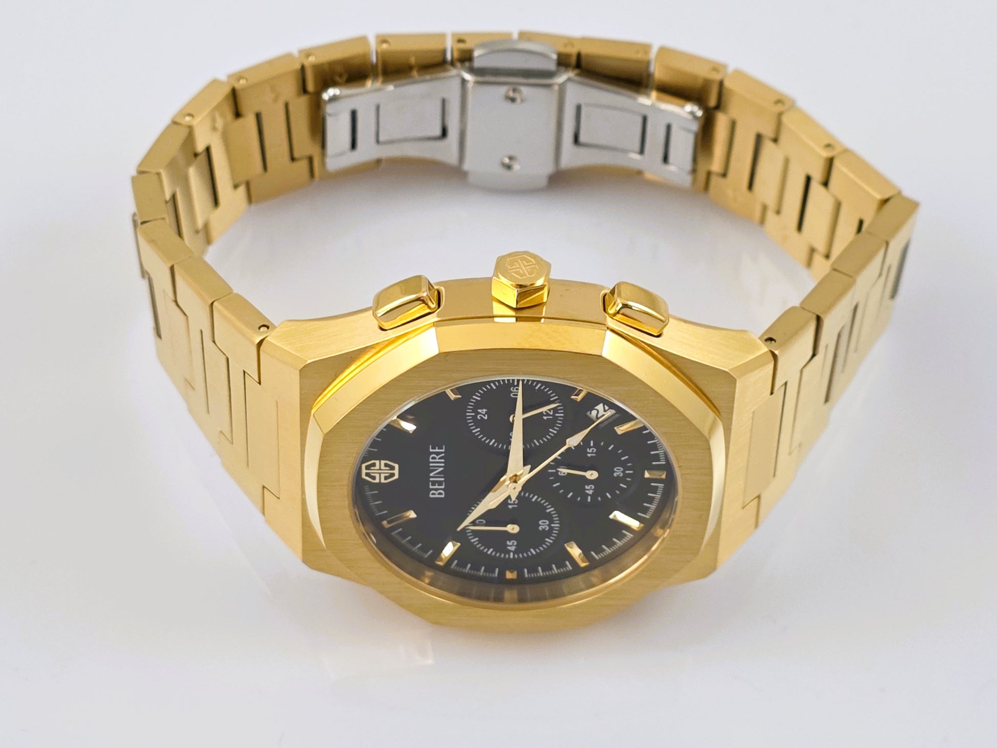 The Doyen chronograph presents a bold, sophisticated aesthetic; fusing razor-sharp modern angular design with the quiet grace of classic elegance and sophistication. The Doyen isn't just a watch; it is inspiration on the wrist, and a masterclass in horological intent. Designed for those who don’t just track time but dictate it, this timepiece serves as a relentless emblem of achievement—a reminder that your goals don't wait for tomorrow. Command Your Moment - the time to execute is now.